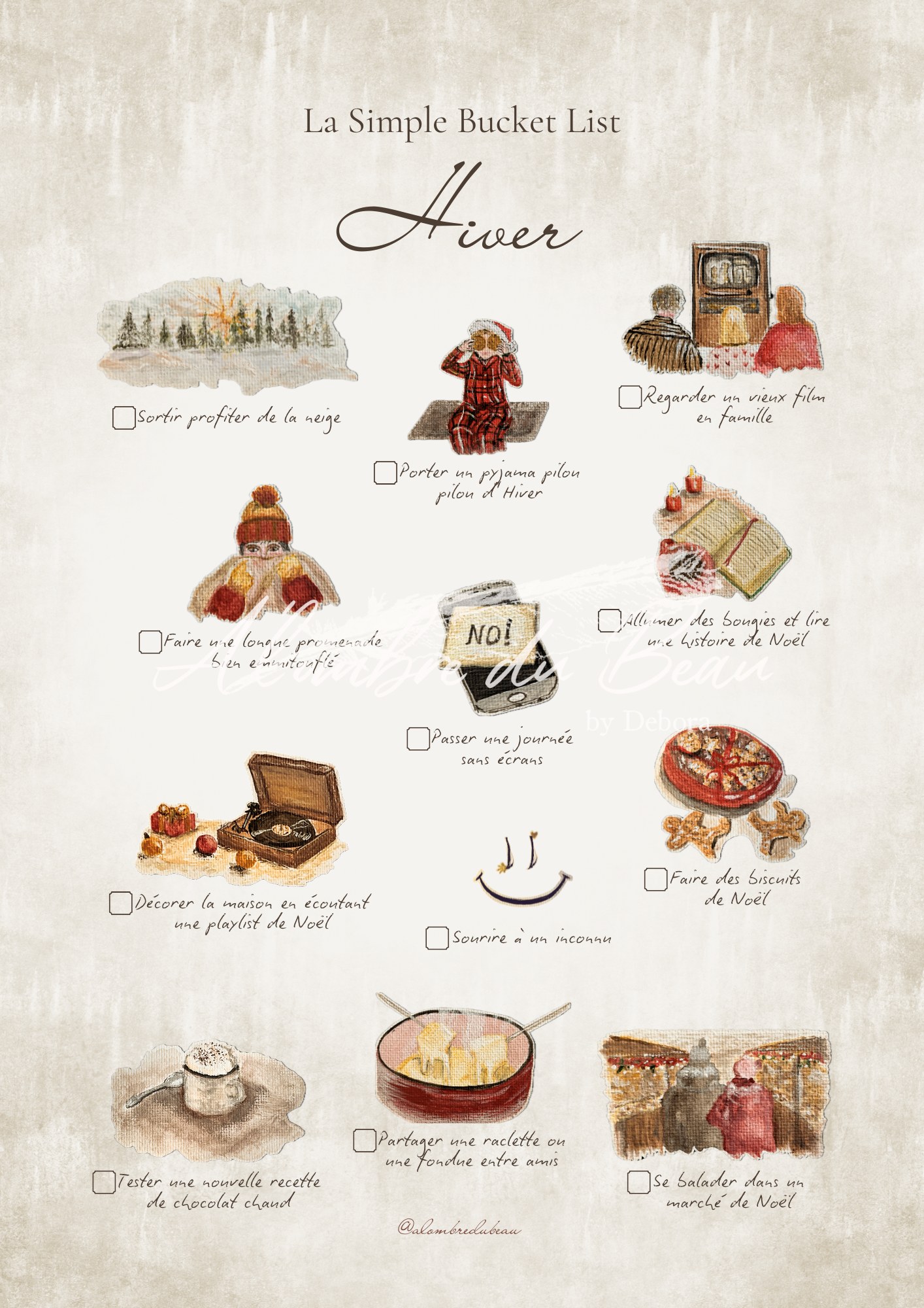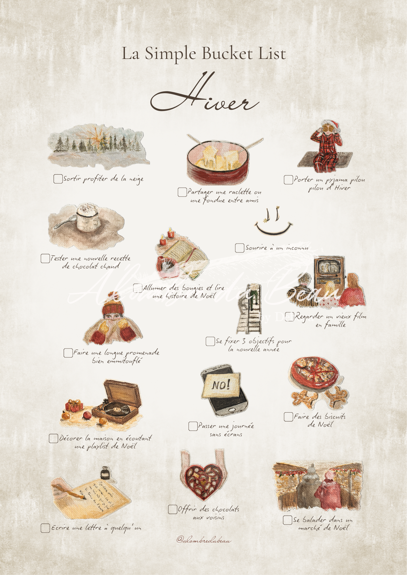 Vivre intentionnellement la période hivernal à travers cette bucket list, un petit bijou d’art et de douceur. Chaque illustration, réalisée à l’acrylique, capture la magie de la saison.