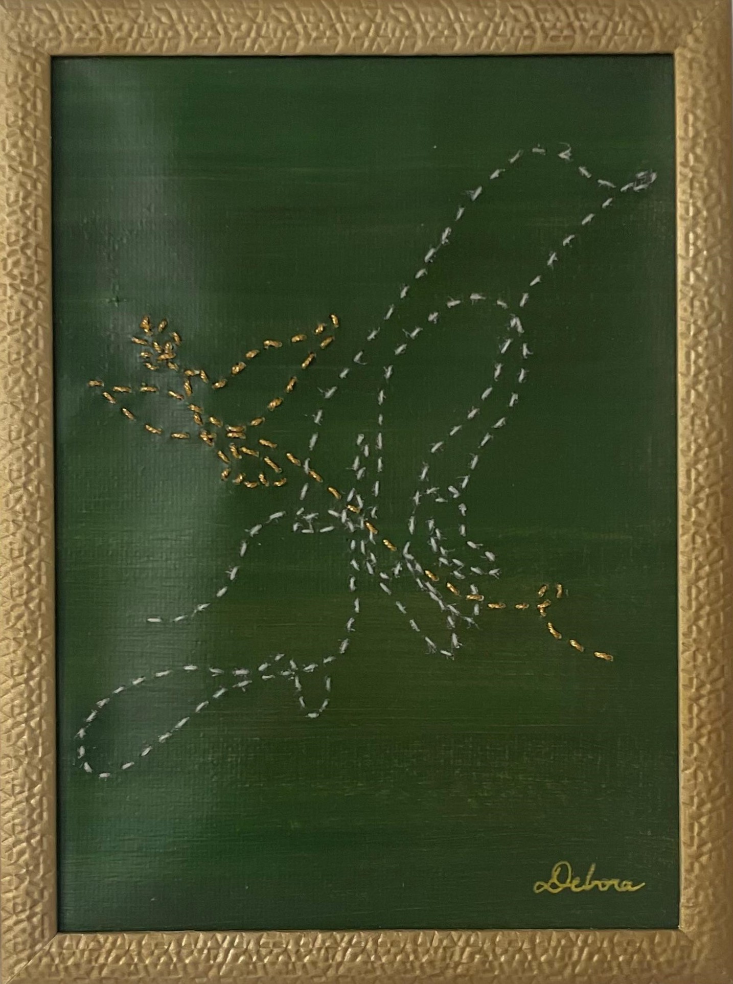 Peinture mixed media sur toile combinant peinture, broderie oneline et cadre upcyclé.