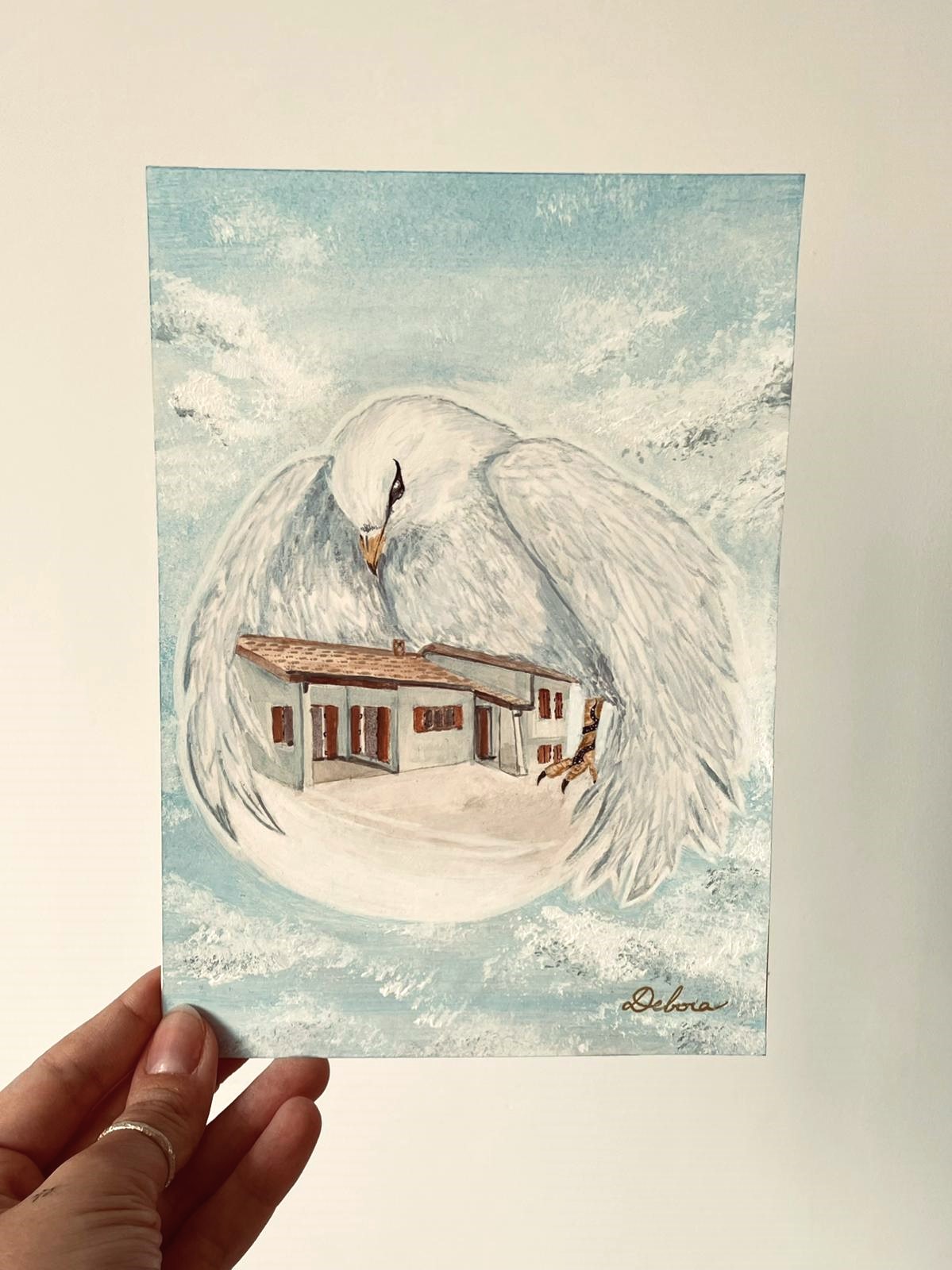 La colombe blanche qui entoure la maison représente la protection. Elle veille, elle enveloppe, elle rassure. Sur elle, on retrouve des détails très personnels : l’eyeliner et le tatouage de la sœur disparue. Des signes discrets, presque secrets, comme une présence douce qui continue de protéger.